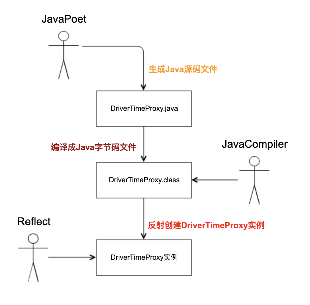 在上图中,大家可以看到,有三个小助手在帮助我们完成整个过程。他们分别是JavaPoet,帮助生成Java源码文件;JavaCompiler,帮助编译Java源码文件;Reflect(反射),帮助动态创建DriverTimeProxy实例。